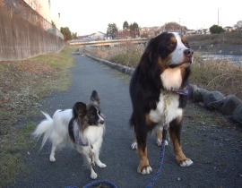 朝の散歩は平井川まで連れてこられた ベルとゆめで~す 初日の出を見るための候補地探しのためにきました わんこ達にとっては、ちょっと迷惑だったかな・? 日の出を見てきょとんとしております 結果は長い散歩になりました